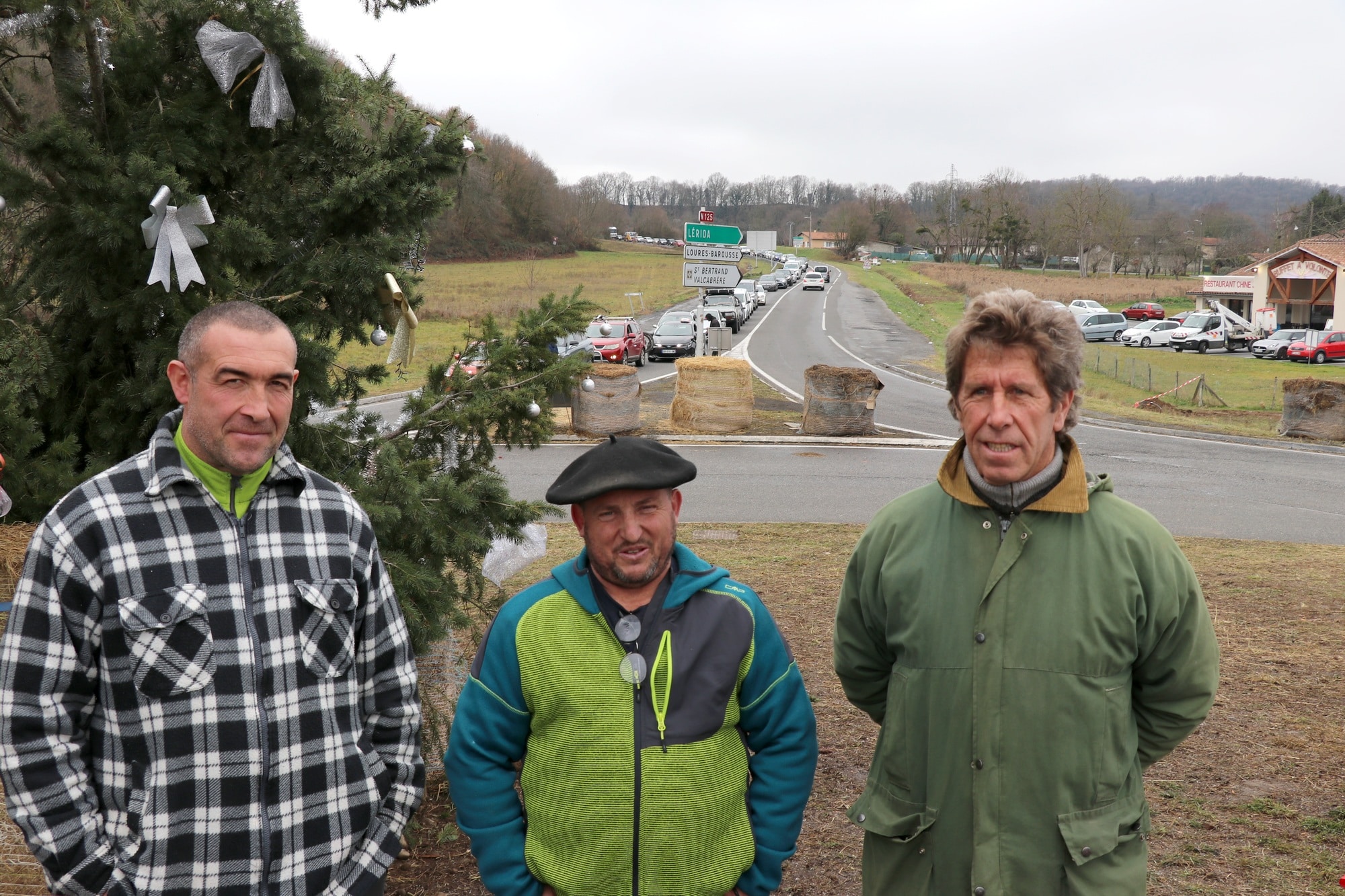 De gauche à droite, Franck Gaillard, Eric Barbé, Joël Charrière, trois agriculteurs commingeois sur le rond point du Bazert à Gourdan Polignan ce lundi 22 décembre 2025.