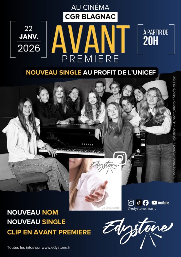 Le groupe toulousain Edystone présentera, en avant-première, le jeudi 22 janvier à 20h au CGR, son nouveau single au profit de l’UNICEF, « Un simple geste », un titre tourné vers l’enfance.