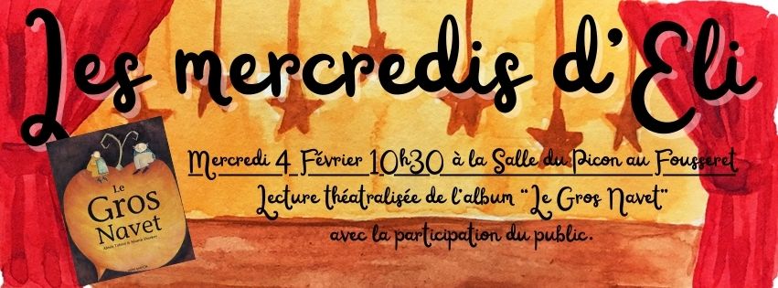La prochaine lecture aura lieu mercredi 4 février à 10h30 dans la salle du Picon, une lecture théâtralisée de l’album « le Gros navet » par Eli qui réalise également les accessoires et les décors.