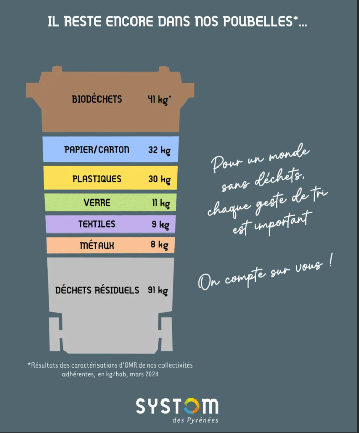 Le SYSTOM des Pyrénées encourage tous les habitants à trier et à sortir les emballages de leur poubelles noires. Avec la hausse continue de la TGAP (Taxe Générale sur les Activités Polluantes, due sur toutes les tonnes enfouies : 69 €/ tonne en 2026 contre 65€ en 2025), le détournement des déchets qui n’ont rien à faire dans les ordures ménagères représente un enjeu considérable.