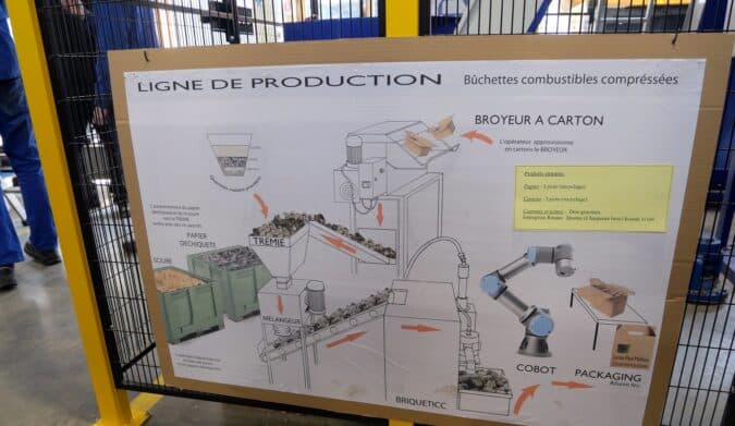 Le process est composé d’un broyeur, d’un mélangeur-compacteur et d’un robot mettant en carton les briquettes cylindriques.