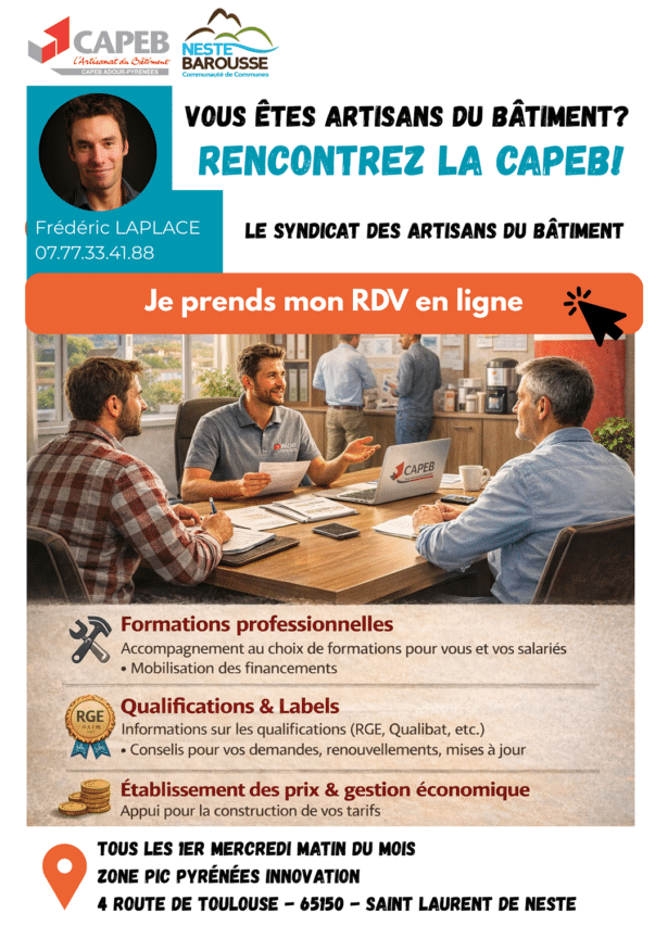 La Communauté de communes Neste Barousse accueillera dans les locaux de la zone Pic Pyrénées Innovation une permanence de la CAPEB tous les premiers mercredis matin de chaque mois dans la salle de réunion du bâtiment « CETIR ».