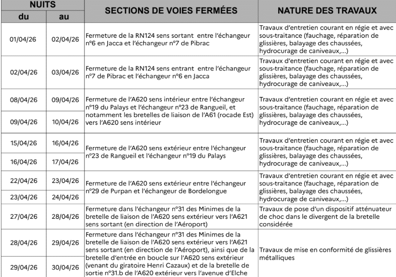 Ce planning est susceptible d’évolution selon les aléas techniques ou météorologiques impactant les chantiers. Des nouveaux besoins de fermetures de nuit peuvent émerger et s’ajouter aux dates programmées.