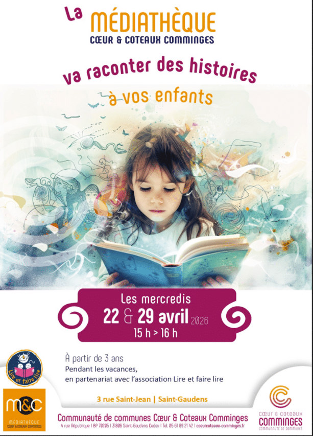 L’association LIRE ET FAIRE LIRE accueillera vos enfants dès 3 ans pour des lectures à l’espace jeunesse de la Médiathèque Intercommunale de Saint Gaudens le mercredi 22avril et le mercredi 29 avril de 15 h 00 à 16 h 00