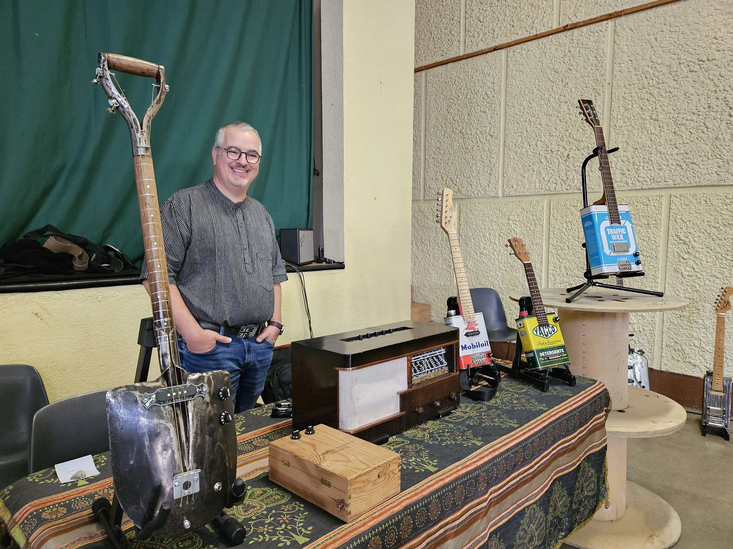 Tout au long de la journée, les visiteurs ont déambulé avec gourmandise et intérêt d’un stand à l’autre, découvrant parmi les exposants tour à tour le luthier de guitares électriques Benoît Blondeau venu de Montréjeau ; les écoles de musique ADAC avec la Claire Prioux flûtiste et directrice, Nathalie Hoffmann harpe celtique, et Nicolas Mazerat accordéon ; la chorale Florentina spécialiste de la Renaissance et sa chef de chœur Marie Denise Dollé, les vinyles et raretés de Chantal Mihailescu. On y trouvait aussi les instruments insolites de Laurent Zanetti, qui exerce à Fenouillet une passion originale, créer à partir de bidons ou d’autres éléments incongrus des instruments venus des premiers âges du blues, quand les esclaves noirs inventaient avec les moyens du bord de quoi faire de la musique ; et bien d’autres.