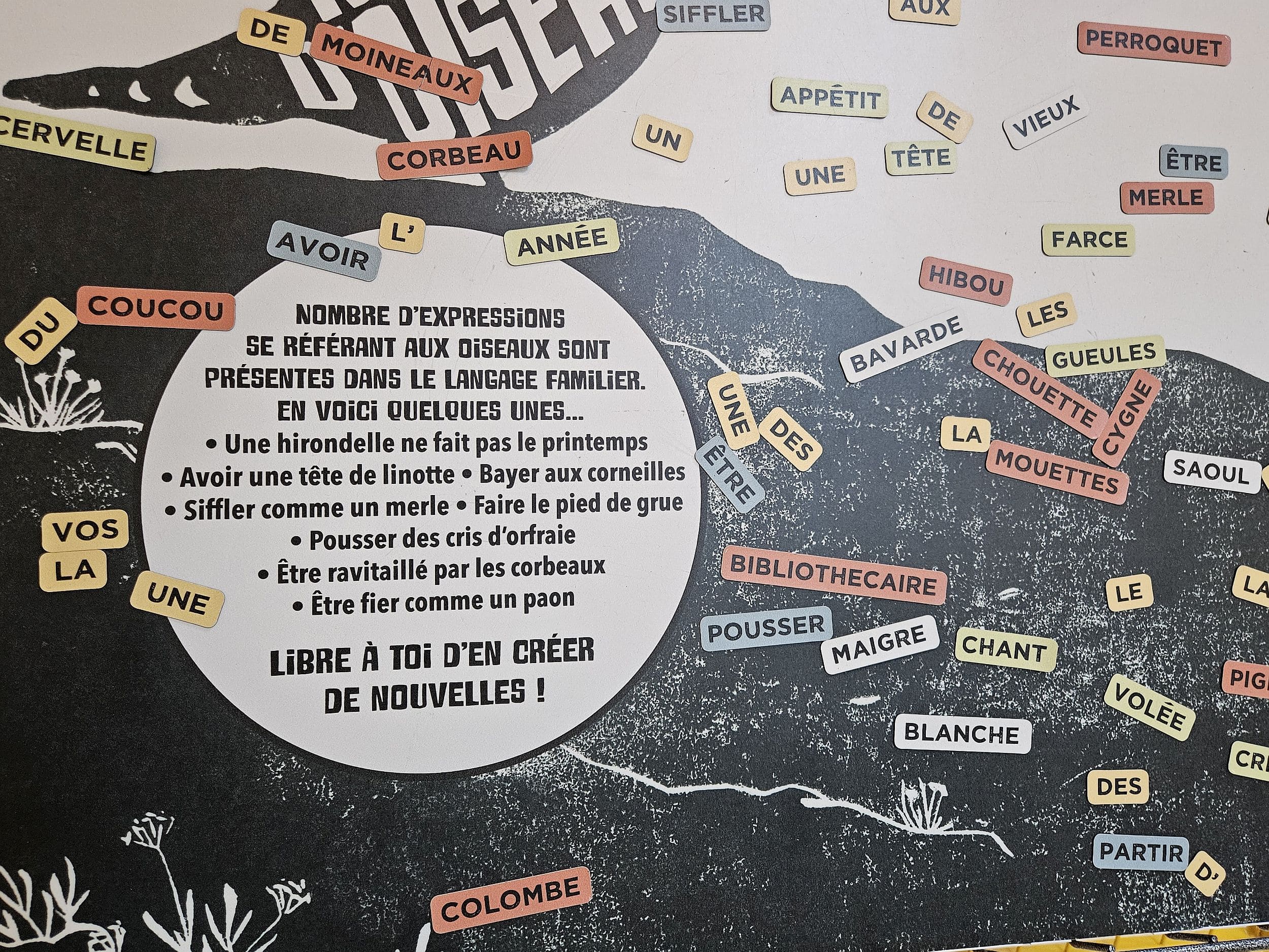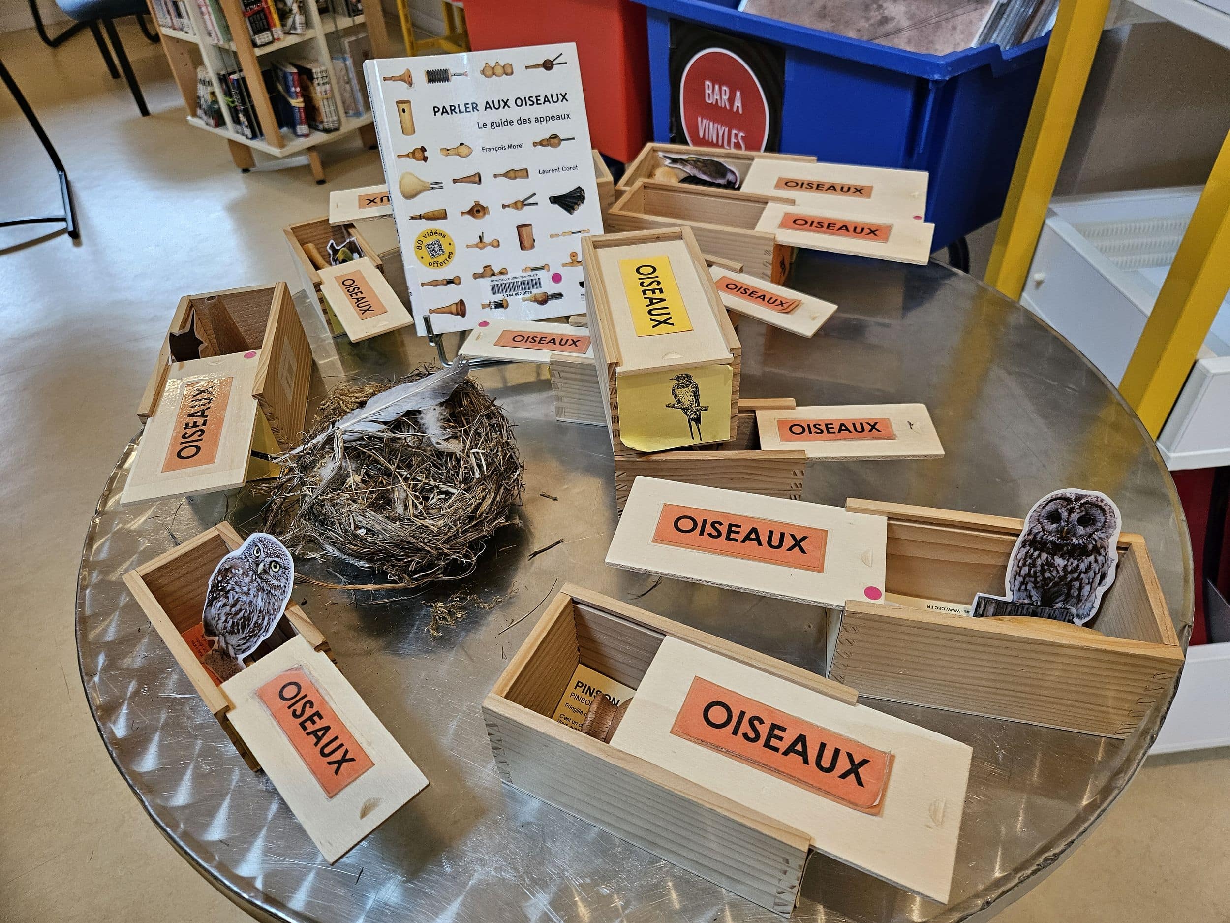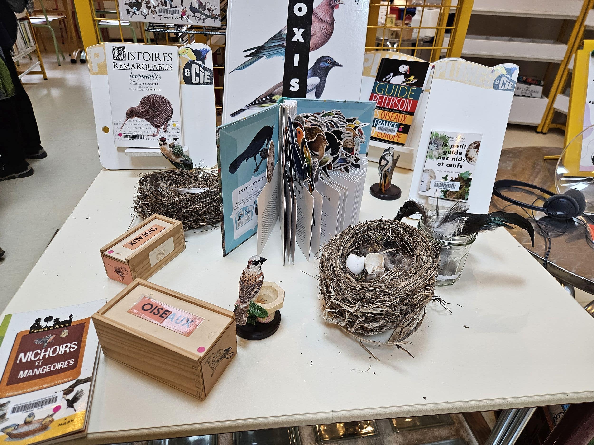 Munis d’un amplificateur de son et de jumelles, prêtés par la médiathèque, les visiteurs peuvent s’égayer dans la ville pour y écouter les chants d’oiseaux et observer les petits volatiles. Un atelier scientifique a fait découvrir les plumes au microscope et une conférence a expliqué les migrations des passereaux. Pour compléter le tour d’horizon, la littérature est là avec de nombreux livres. Un panneau pêle-mêle permet de reconstituer à l’aide de mots magnétiques, les expressions de la langue française en rapport avec les oiseaux, tête de linotte, gai comme un pinson, fier comme un coq, etc.