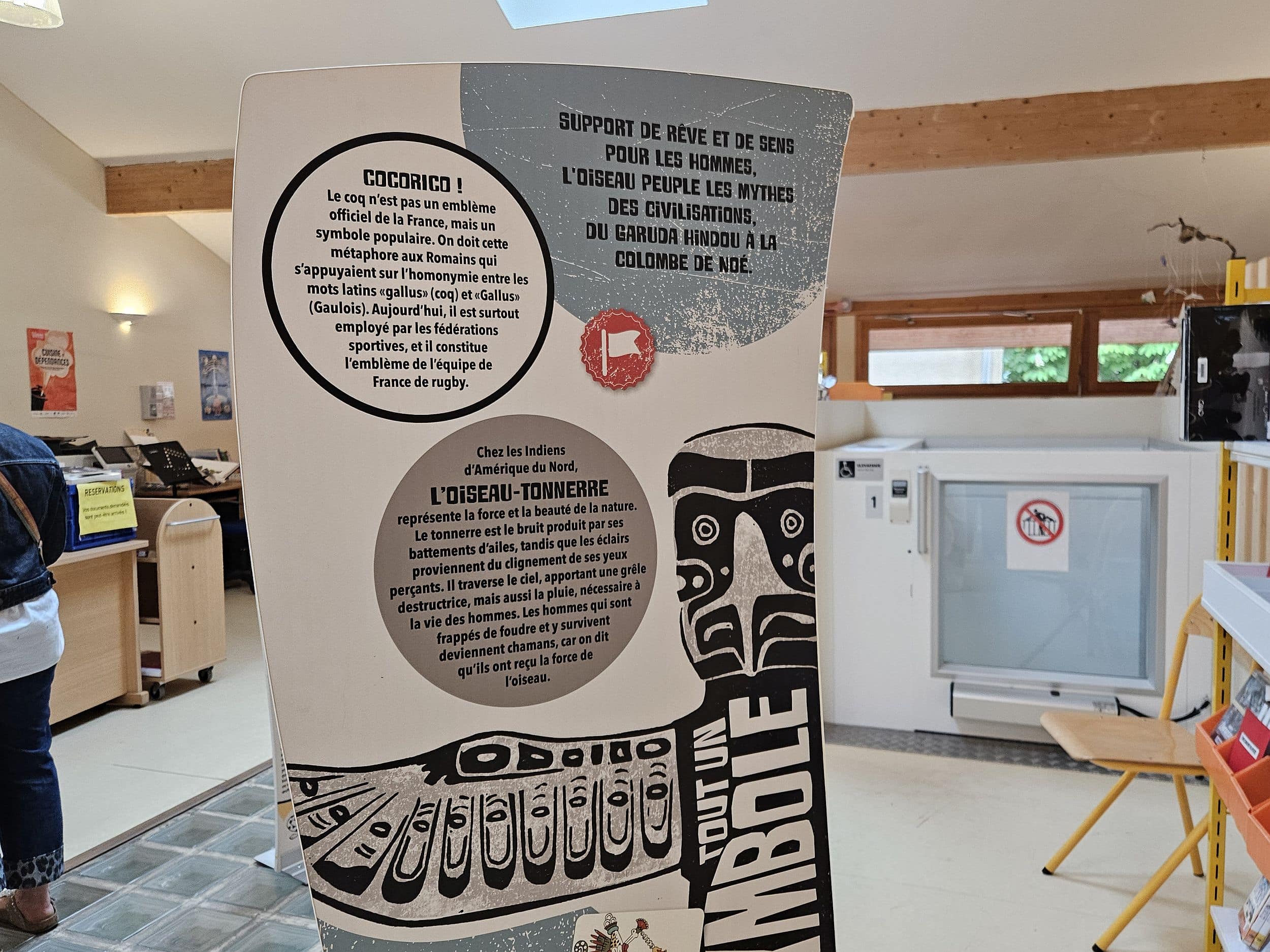 Interactive car, ainsi que l’explique la médiathécaire Bénédicte, non seulement les visiteurs se plongent dans le monde ornithologique par les sens, et toucher, écouter, voir les éléments concrets (nids, appeaux, coquilles d’œufs, documents, amplificateur de son, panneaux explicatifs…), mais la plongée immersive passe aussi par l’informatique. Des tablettes numériques, prêtée par la médiathèque, permettent de scanner des pictogramme connectés, placés sur les panneaux ou les silhouettes d’oiseaux suspendues au plafond. Et sur l’écran apparaissent des explications, des jeux, des quizz…, un mode Explorateur permet de se balader virtuellement dans l’expo.