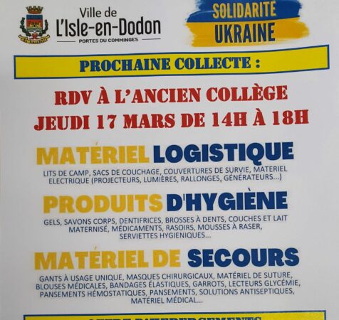 La commune de L’Isle-en-Dodon soutient le peuple Ukrainien et continue ses collectes de dons.