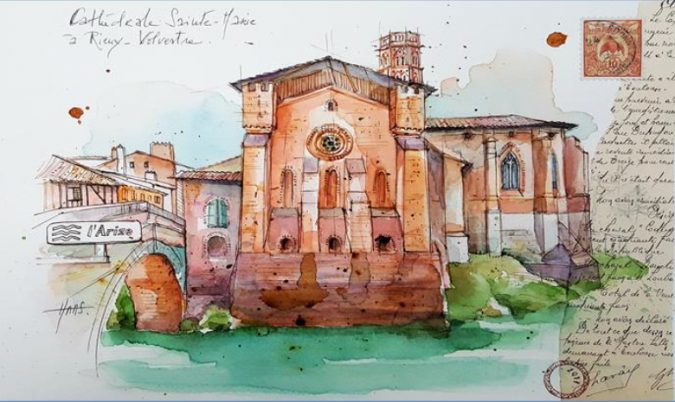 En visitant cette exposition on redécouvre Toulouse mais aussi Rieux. Portes anciennes, vues d’ensemble du centre historique, de la cathédrale, des rives de l’Arize au pont d’Auriac… Associant aquarelle, collage, dessin à la plume et autres techniques, elle donne ainsi à ses œuvres une originalité, saluée par les prix qui lui ont été décernés dans les expositions et salons où elle a participé. Émotion, enthousiasme, surprise…