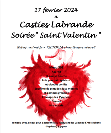 Le dynamique comité des fêtes du village de Casties Labrande organise le samedi 17 février 2024 une soirée Saint Valentin à partir de 19 h.30