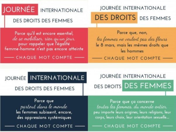 Commençons par l’intitulé de cette journée. L’ONU parle de la journée internationale des femmes (c’est d’ailleurs l’intitulé officiel), alors que la France a plutôt tendance à privilégier la journée internationale des droits de la femme.