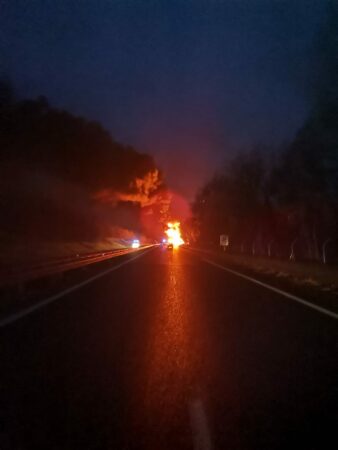 La citerne est totalement embrasée, elle contient 20000L de sans plomb 95 et 16000L de gazole. l’autoroute est coupée.