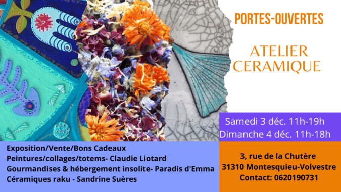 A l’occasion des portes-ouvertes de Noël, l’atelier céramique de Sandrine Suères à Montesquieu-Volvestre invite l’artiste plasticienne Claudie Liotard, Le paradis d’Emma (gourmandise et hébergement insolite) et David Reynies (menuisier).