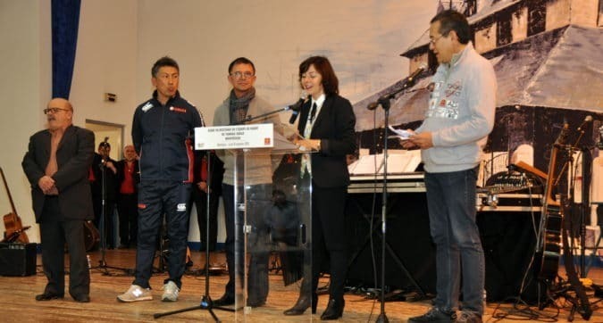 L’équipe Yamaha Jubilo, championne de rugby 2015 du Japon était là. Au total, avec l’équipe de jeunes et l’encadrement, ce sont près de 80 personnes qui ont fait le déplacement pour effectuer un stage d’une quinzaine de jours dans notre région. Tous en survêtement, et tous très respectueux durant les différentes allocutions.