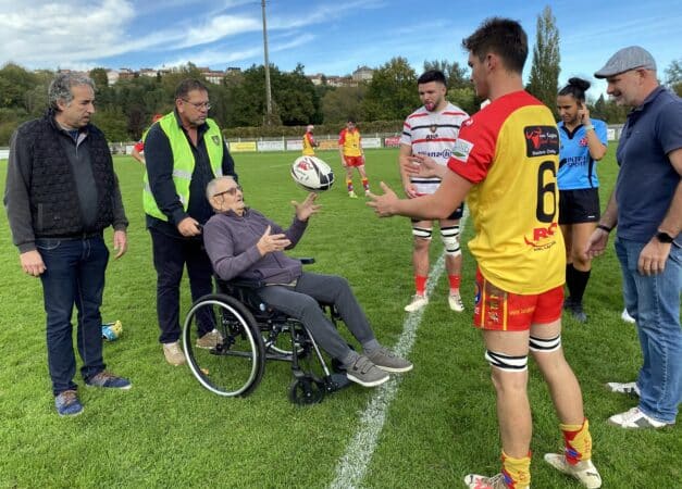 Claude Rey pénètre sur le stade dans son fauteuil roulant et donne le coup d’envoi du match